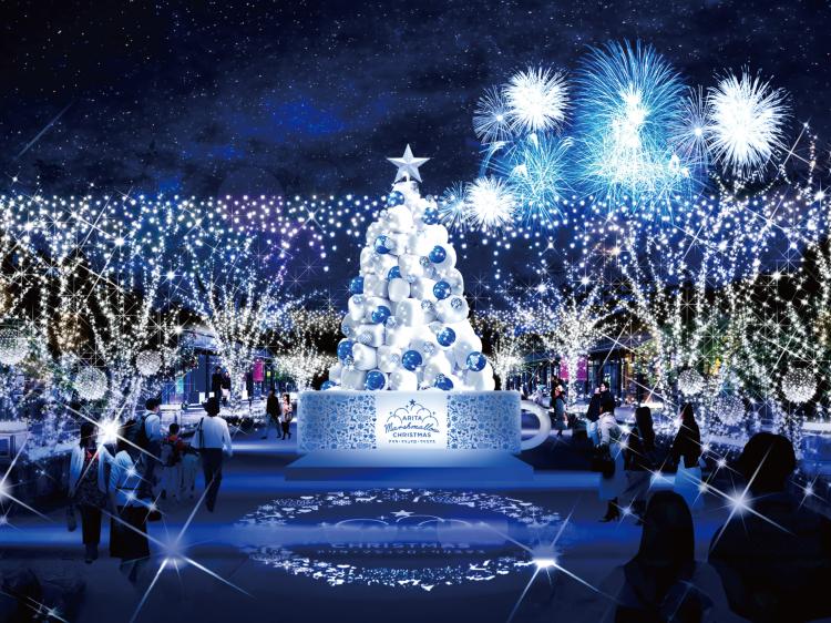 有田焼のショッピングリゾート「アリタセラ」に、巨大なマシュマロツリーが登場!夜は有田焼の「白と藍」をイメージしたイルミネーションが輝き、幻想的かつポップな世界観を楽しめます。焼きマシュマロ体験やホットドリンクで温まりましょう。