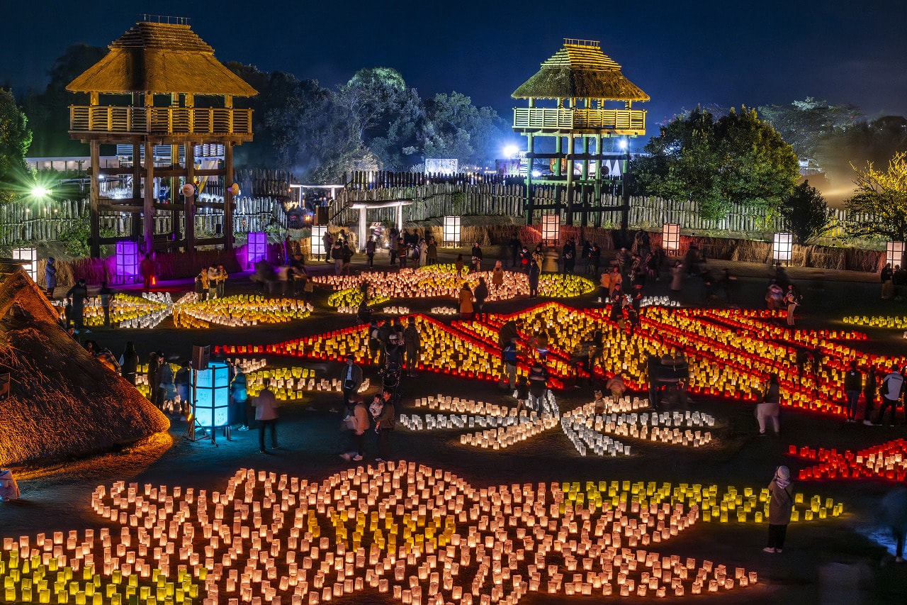 今週末がいよいよフィナーレ! 広大な遺跡エリアが数千個のキャンドルとライトアップで彩られます。夜空に浮かび上がる熱気球の「ナイトグロー」や、キャンドルによる「光の地上絵」は圧巻。弥生時代の夜にタイムスリップしたような神秘的な体験を。
