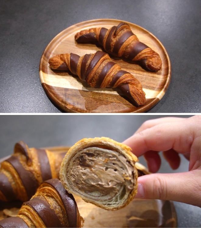 カカオを練り込んだ生地と、プレーンなクロワッサン生地の2種類を使用。 「もちっ」とした食感と「パリっ」とした食感、その両方が楽しめます。 中には自家製のガナッシュクリームがぎっしり!
