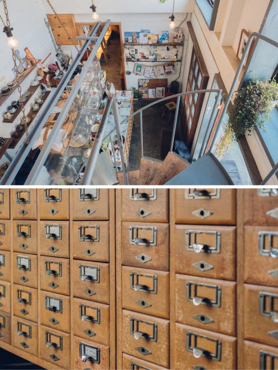元々2階建てだった建物の天井を抜き、開放的な空間を創出。内装には農家からもらった古いタンスの引き出しを棚として再利用したり、図書館で廃棄予定だったカードケースをディスプレイに使ったりと、古道具を積極的に活用している。着台に足をつけてテーブルを作り、のれんも自身で染めた。