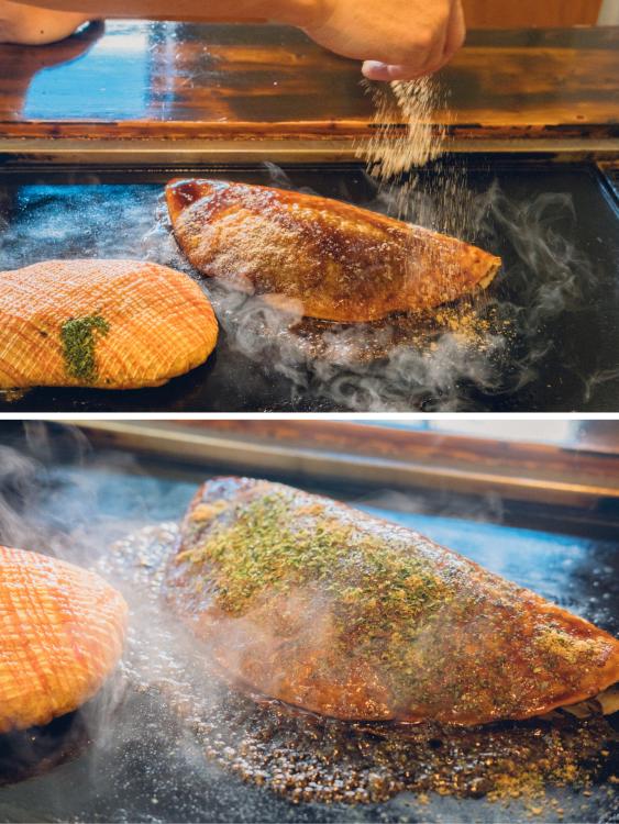 鉄板の上で焼き上げられたお好み焼きは、関西風でもなく、広島風でもない。生地で具材をはさんだ独特のフォルムだ。