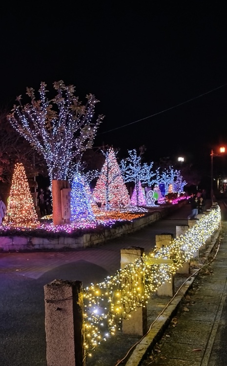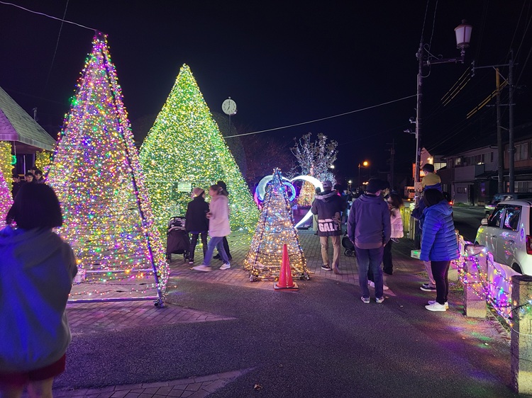 駅横の「電車が見える公園」がメイン会場。木々や広場が色とりどりのLEDで飾られ、SNS映えするオブジェも登場。昼間とは全く違う、ロマンチックな雰囲気に包まれます。