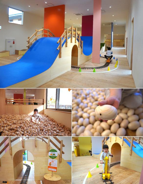 「ボールプール」のボールも“木”。国産木材をすべすべに磨いたタマゴ型のボールで、4種類の木、ヒノキ、タモ、リュウキュウマツ、カエデを使用。種類によって違う手触りや重さを感じながら子どもたちに遊んでもらいたい思いから作られています。