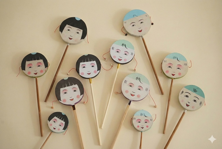「バタバタ市」の名前の由来にもなっている郷土玩具「バタバタ」は竹と和紙で作られた素朴な豆太鼓で、この2日間しか手に入らない郷土玩具。振ると「バタバタ」と軽快な音が鳴るのが特徴で、かつては天然痘除けのまじないとして重宝され、現在では子どもの健やかな成長や家内安全を願う縁起物として親しまれています。