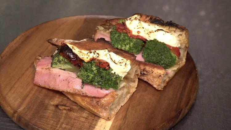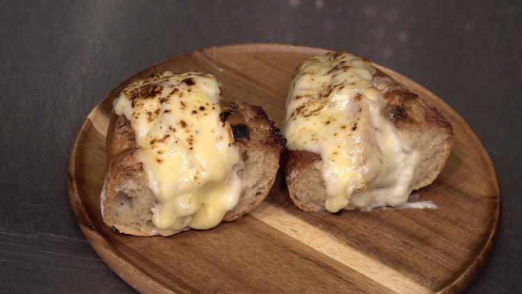 ハーブ鶏、シメジ、マイタケをクリーミーに仕上げた豪快なサンド。アンチョビでソテーしたキャベツが隠し味です。