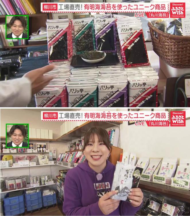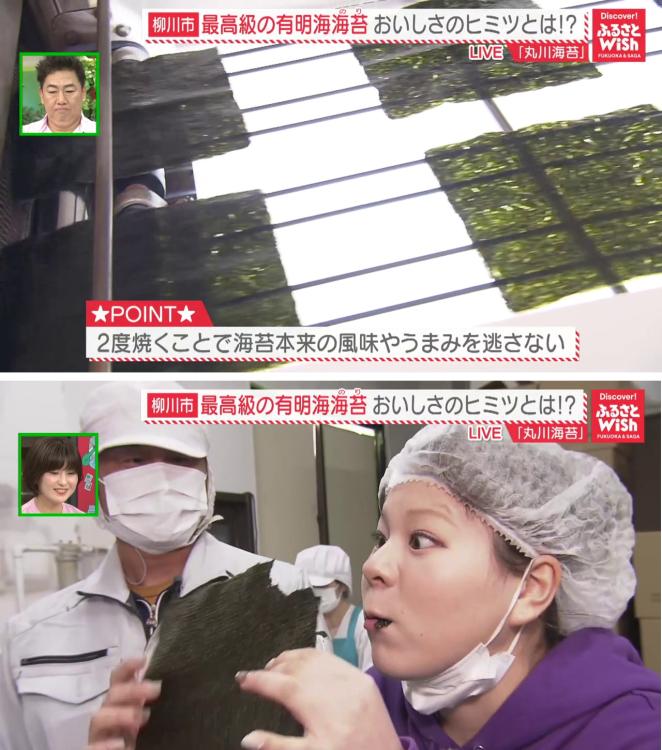 焼きたての海苔を試食した大川紫磨リポーターは、パリッとした歯切れの良さに驚き!「ほんのりと磯の香りがして、食べるだけで有明海の情景が目に浮かびます」とおいしさに感動していました。