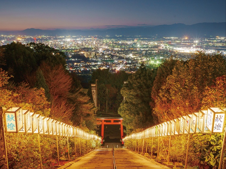 131段の石段が灯籠の光で彩られる、幻想的な冬のライトアップ。澄んだ空気の中、光の道が本殿へと導く絶景と、高台から望む夜景を同時に楽しめます。