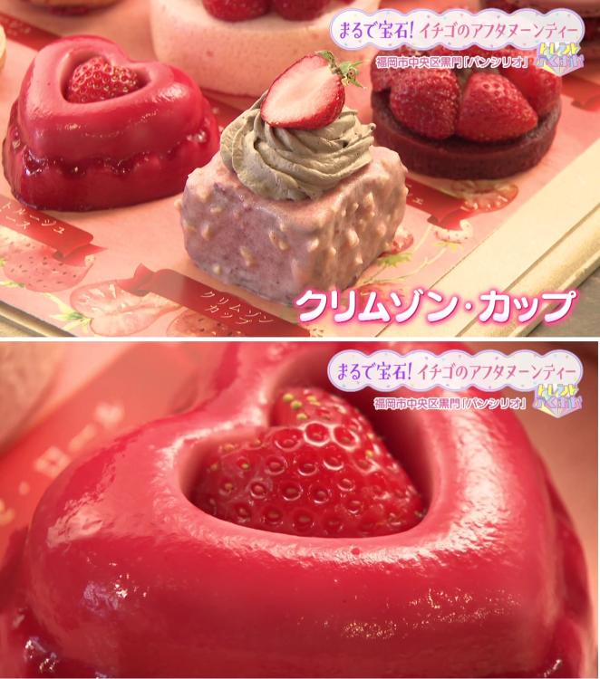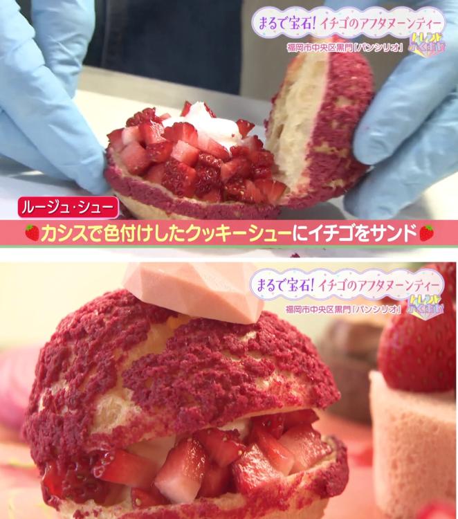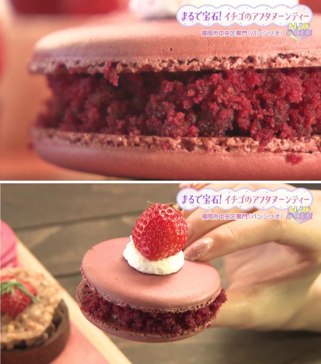 カシスで色付けしたマカロンに、砕いたイチゴのケーキをまぶした華やかなスイーツです。「外はサクサク、中はねっとり。イチゴ味のスポンジが入っていて食感が楽しい!」 と山下リポーターも大満足でした。