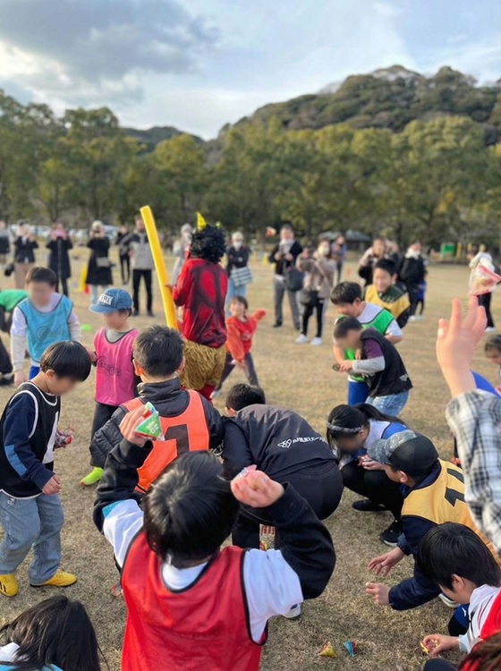 芝生の上を全力で駆け抜ける持久走大会で、ゴールした後にはメインイベントの豆まきが待っています。みんなで力を合わせて鬼を追い払えば、寒さも忘れて心も体もポカポカになること間違いなし!