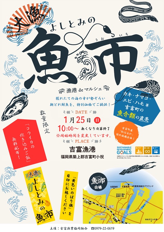 福岡県・吉富町の吉富漁港で、毎回大人気の『よしとみの魚市~漁港deマルシェ~』が1月25日(日)に開催されます!港の活気とおいしい香りに包まれるこのイベントは、“冬の味覚の宝庫”。新鮮な海の幸を求めて、朝から多くの人が集まります。