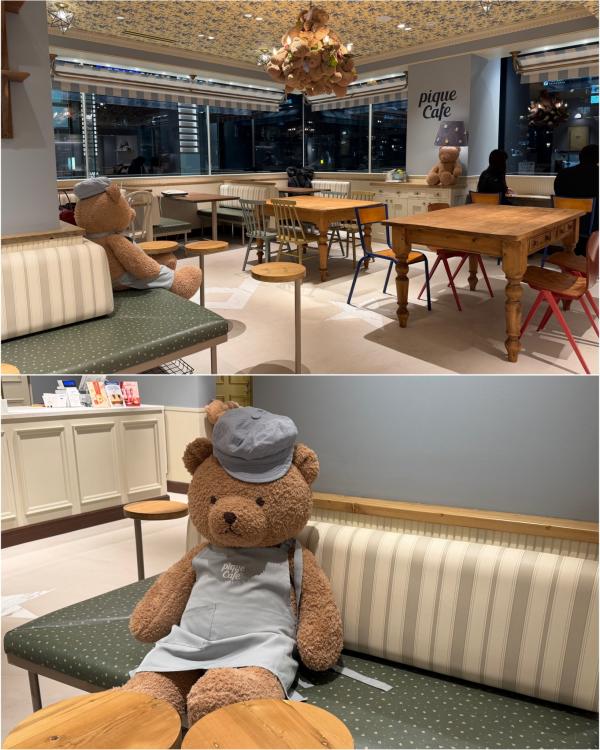 店内はテーブル席とカウンター席があり、中央のソファ席には、なんとマスコットのピケベア店長がちょこんと座っています。