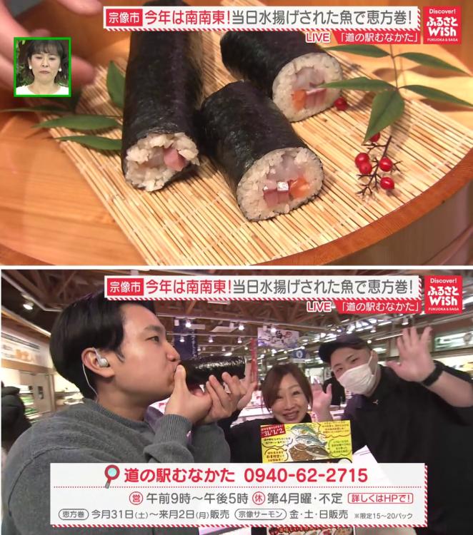また、宗像自慢の活きのよい魚が贅沢に巻かれた「恵方巻」にも注目!1月31日(土)から2月2日(月)までの3日間、数量限定で特別販売される「恵方巻」は、その日に水揚げされた鮮魚が主役。