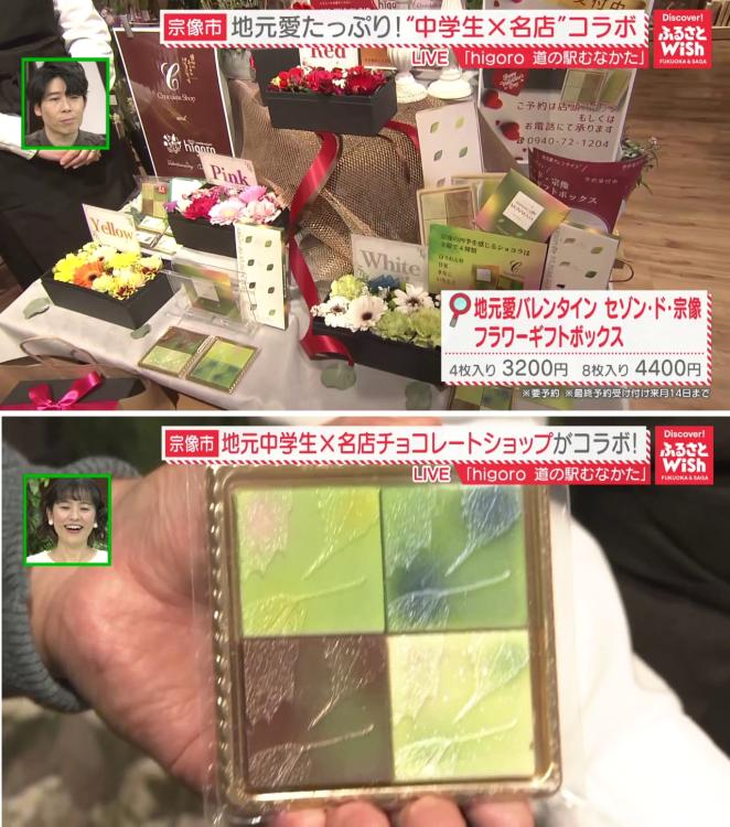 地元の宗像市立自由ヶ丘中学校の生徒と、博多の名店『チョコレートショップ』がコラボした「地元愛バレンタイン セゾン・ド・宗像 フラワーギフトボックス」(4枚入り3200円、8枚入り4400円)」が、現在予約受付中です(最終受付は2月14日まで)。