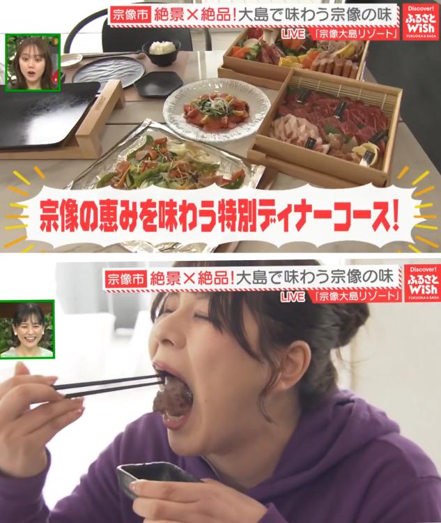 土鍋で炊き上げたツヤツヤのご飯と一緒に、焼きたての宗像牛を頬張った大川リポーターは「お肉にしっかり脂がのっていて、土鍋ご飯との相性も抜群!」と、その贅沢な味わいに大興奮。