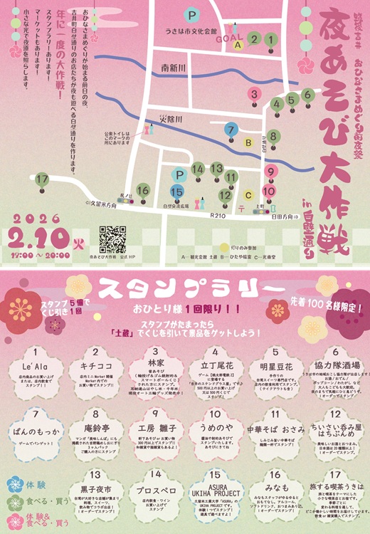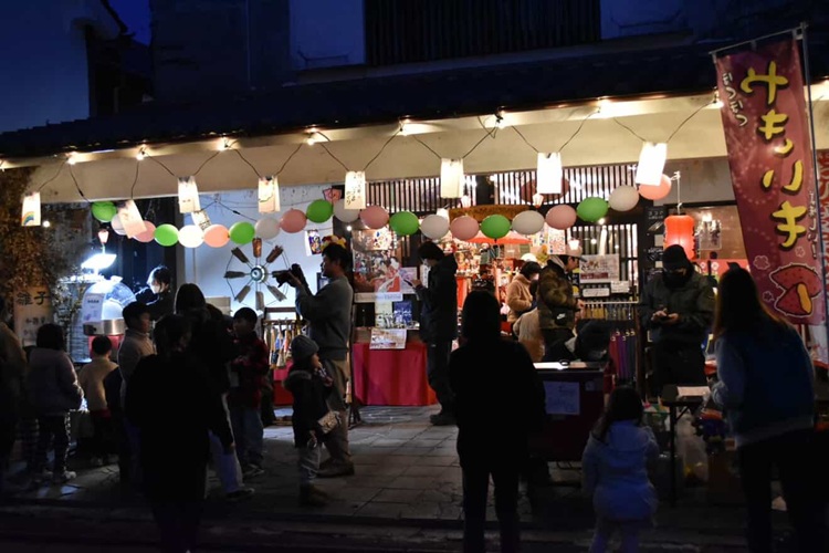 翌日から始まる『筑後吉井おひなさまめぐり』の前夜祭として開催されるこのイベント。いつもは夕方に閉まる各店が、この日は特別に夜まで営業。夜の帳が下りるころから、ちょうちんの温かな灯りが白壁を照らし、非日常的な空間が広がります。各店を巡るスタンプラリーも実施。買い物や体験をしてスタンプを5個集めると、1回くじを引くことができます(景品は先着100人限定)。