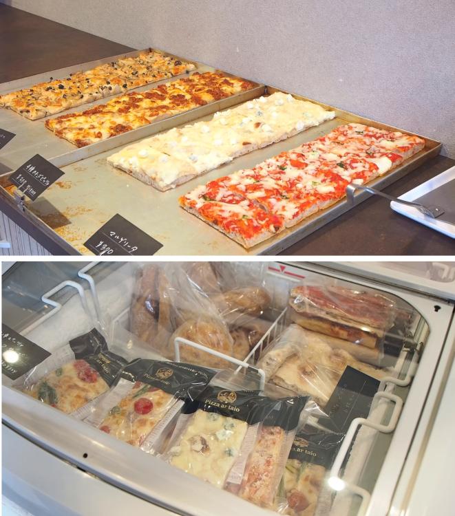 お店にはピッツァの工場が併設されており、焼きたてはもちろん、お得な規格外品なども販売されています。