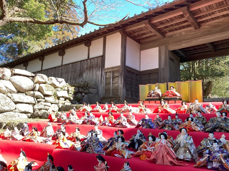 「筑前の小京都」と呼ばれる秋月の町全体がひな人形で彩られます。週末には、長屋門の階段を利用したひな人形の展示が行われ、歴史ある町並みと調和した美しい光景が見どころです。