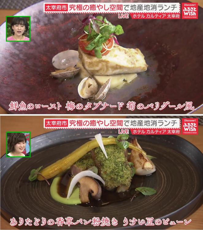太宰府ならではの梅とオリーブのソースでいただく鯛のローストは、身がホロホロ。大川紫磨リポーターも「魚の旨みが噛むたびにじゅわじゅわ染み出てきます!」と絶賛。有田焼の美しい器に、八女産のタケノコなど地元の旬が彩りを添えます。