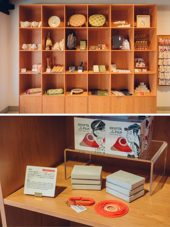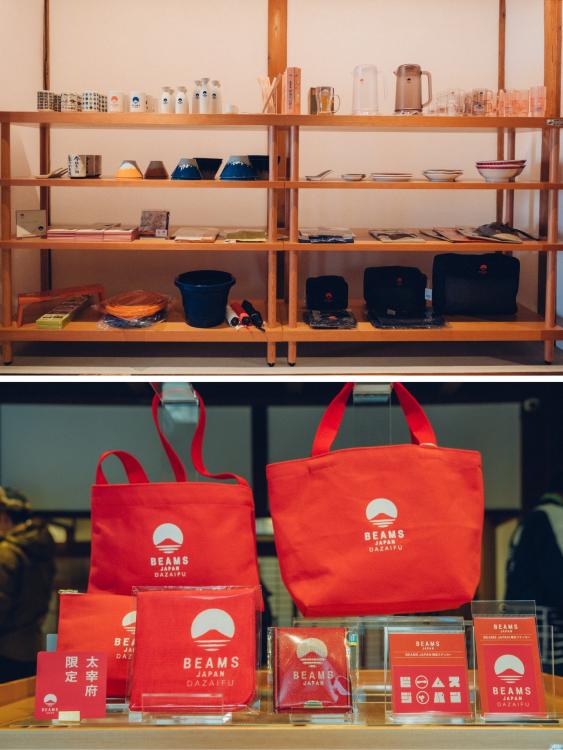 太宰府店のもうひとつの顔が、福岡の地元事業者とのコラボレーション商品だ。店の左側の棚には、グッドローカル九州とビームスが共同で開発した限定品が並ぶ。