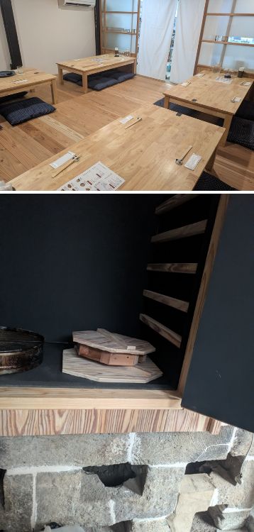 こちらの店舗、元は築100年超の古民家。奥行きが深く、中央にはフローリングの小上がりがあり、お子さん連れでもゆっくり過ごせる心地よい空間です。さらにその奥にある燻製室には、驚きの光景が。なんと、江戸時代からこの場所にあった本物の「かまど」を大工さんの手で改造し、薪やサクラのチップで燻製ができる工房として蘇らせたのです。