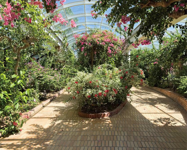 温室内は、植生と建物の雰囲気を活かして「ヨーロッパ」「アジア」「北米」「南米」の4つのエリアに分けました。例えば、ブーゲンビリアが咲き誇る小径は、歴史的な背景をエッセンスに加えた『ヨーロッパ』、蓮の葉がたゆたう区画は情緒豊かな『アジア』として演出しています。そしてサボテンが並ぶエリアは陽気な『北米』、最奥の木々が生い茂る場所は、まさにジャングルのような『南米』。
