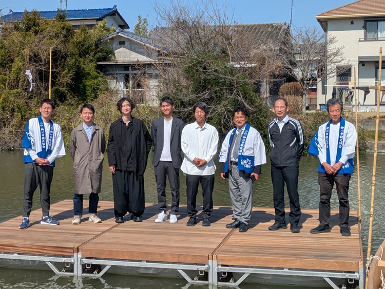 プロジェクトの発起人は、柳川市観光協会の氏家将利さん(写真左端)。「柳川の掘割は、世界でも類を見ない特徴です。その掘割をもっと感じて、価値を知っていただけるものを作りたい、という想いからスタートしました」と、氏家さんは語ります。氏家さんの周りには、乗富鉄工所の乘冨賢蔵さん(写真左から3番目)、みずべデザイン室の石本大歩さん(〃左から2番目)という頼りになる面々がそろっていたことも、実現への大きな力となりました。常日頃から柳川のこれからを話し合っていた3人で、2025年秋ごろに「掘床」プロジェクトを始動。そして約半年後には、この新しい場所の完成へとつながっていったのです。