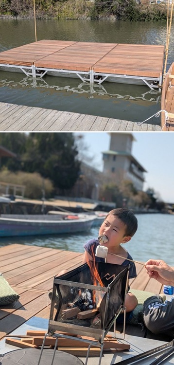 最大の魅力は、その使い勝手の良さにあります。実際に乗ってみると、いかだのように水面にぷかぷかと浮かぶ感覚を味わいながらも、驚くほどの安定感に包まれます。先日行われたお披露目会では、小さなお子さんたちも、まったく怖がることなく「掘床」にひょいと飛び乗り、おいしそうに焚き火でマシュマロを焼いて頬張る微笑ましい光景が見られました。また、夕方には同じ「掘床」の上に本格的な茶室がしつらえられ、水音を背景にお茶を嗜む風流なひとときが繰り広げられました。