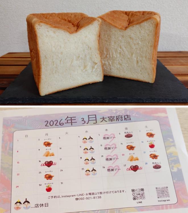 糸島産の小麦粉をブレンドして作られる、ふわふわモチモチの食パンが自慢の同店。プレーンの食パンは毎日焼き上げていますが、味の付いたパンは月、金、土曜の限定販売。曜日ごとに違う食パンが楽しめます。