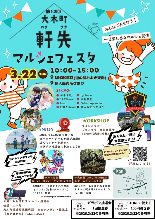 福岡・大木町の道の駅おおき隣にある交流支援センターWAKKAと無人販売所ひばりで、3月22日(日)に『第12回 大木町軒先マルシェフェスタ』が開催されます。子どもたちが主役になって、一日中思いっきり遊び尽くせるワクワクいっぱいのイベントです!