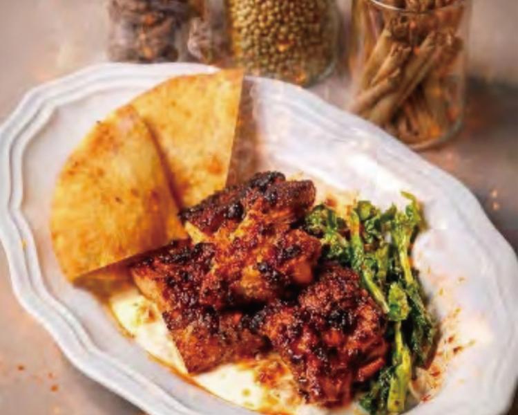 A.「野菜、ナン、メイン料理を組み合わせた、一食として満足できるボリュームのプレート「GohGanスパイシーグリルドチキン」(税込1,200円)です。8種類のスパイスを自家調合したタレと、ヨーグルトベースのマリネで仕込んだチキンを使用しています。スパイスの香りや奥行きを感じられながらも、強すぎないバランスに仕上げているのが特徴です。会場では鉄板で焼き上げ、目の前で切り分けて提供するライブスタイルにする予定なので、香りや臨場感も含めて楽しんでもらえると思います」。
