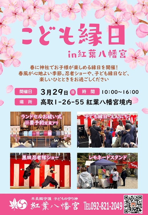 安産や子どもの守護神として親しまれている紅葉八幡宮(福岡市早良区)で、3月29日(日)に『こども縁日in紅葉八幡宮』が開催されます!