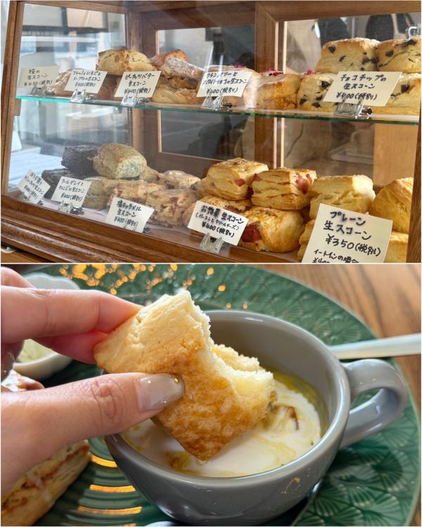 私はプレーンのスコーンをスープに少しつけて食べてみたのですが、これが意外と相性抜群。