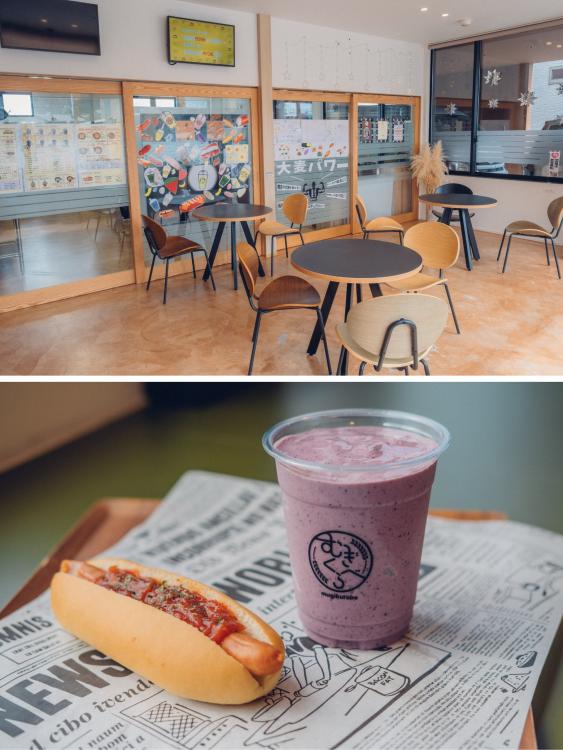 店で使うコッペパン・トースト・ピザ生地には、九州産小麦「ミナミノカオリ」を100%使用。大麦スムージーには、香川県産の六条大麦「イチバンボシ」をジュレ状に加工したものを使用しています。