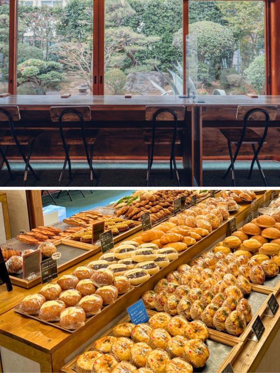 店内に入るには、まず玄関でスリッパに履き替える。パン屋というより、誰かの家にお邪魔するような感覚。店の真ん中にはこんがり焼き色のついたパンたちがずらりと並び、縁側を思わせるイートインスペースからは、手入れの行き届いた和風の中庭が眺められる。