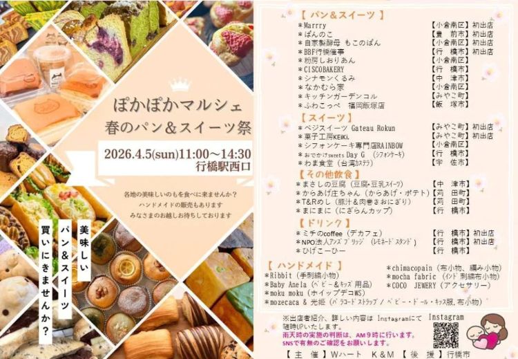 4月5日(日)、福岡県行橋市のJR行橋駅西口で『ぽかぽかマルシェ 春のパン&スイーツ祭』が開催されます。昨年も大盛況だったこのイベント。地元で人気のパン屋さんや、こだわりのスイーツショップ、ハンドメイド雑貨がずらりと並びます。