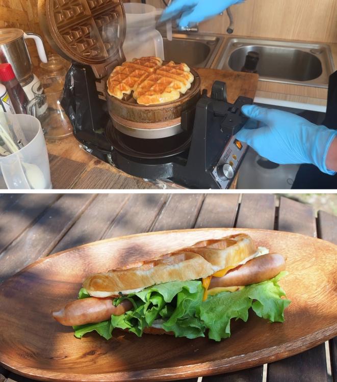 クロッフルをバンズに見立てた惣菜系メニューも人気。