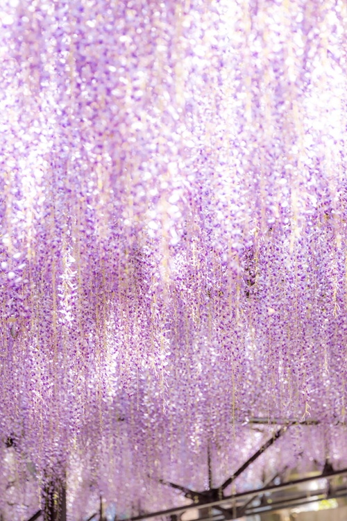 日が落ちると、会場はますます幻想的な雰囲気に。毎日19時からライトアップが行われ、夜の闇に紫色のカーテンが浮かび上がります。4月18日(土)は、和傘と竹灯籠による一夜限りの特別な演出も!
