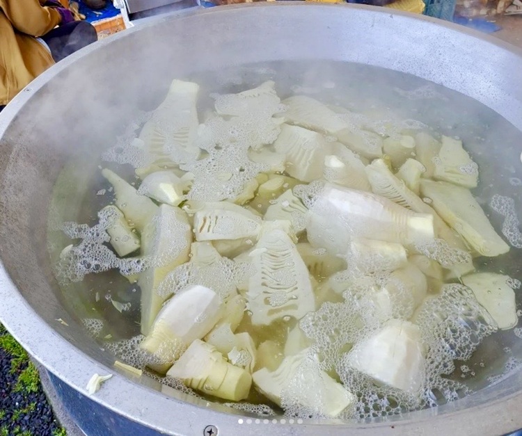 地元農家さんが早朝に収穫した、鮮度抜群のタケノコが並びます。名物の「ゆでたけのこ」は、この時期だけの格別な香りと味わいです。