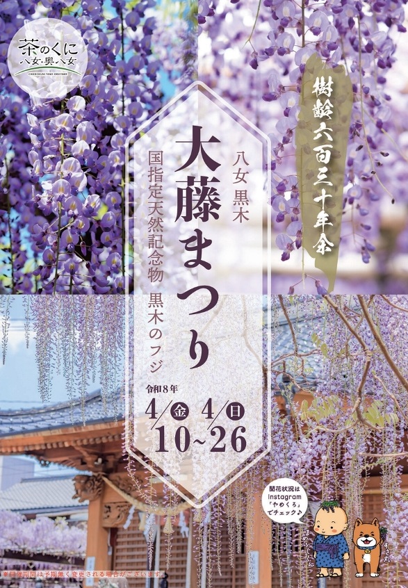 樹齢約620年を誇る「黒木の大藤」が見ごろを迎えます。1メートルを超える花房が降り注ぐ景色はまさに絶景!夜にはライトアップも実施されます。
