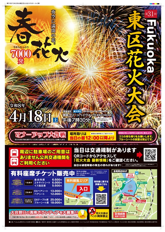 福岡市内で最大級の規模を誇る『第31回Fukuoka東区花火大会』(福岡市東区)が、4月18日(土)に開催されます。澄んだ春の夜空を舞台に、約7,000発もの花火が次々と打ち上がり、香椎浜の海面を色鮮やかに照らし出します。